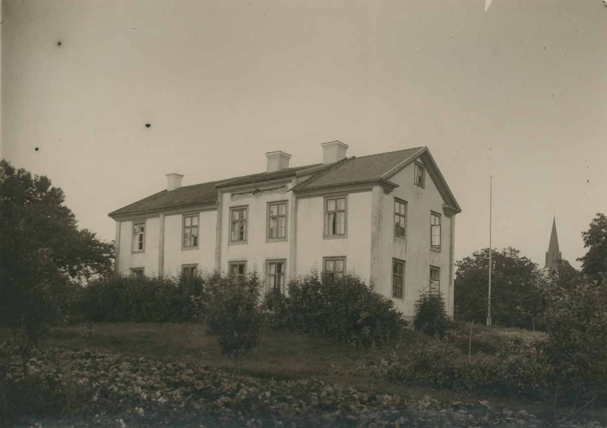Fagerhults herrgård sedd från trädgården. Den är uppförs i timmer ,och är vitputsad.. En äldre byggnad i en våning är tillbyggd av Rosander i mitten på 1800-talet.