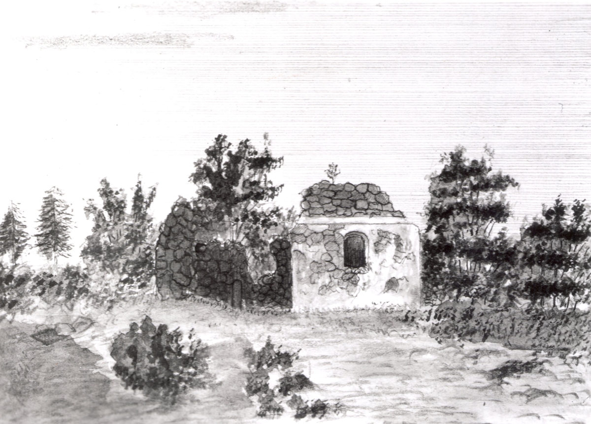 Ruinen efter Ukna gamla kyrka. Akvarell av Eric Ihrfors omkring 1880.