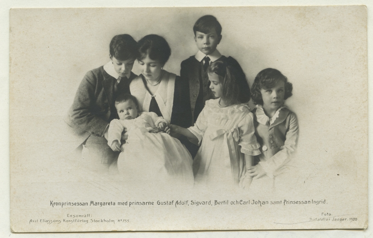 Kronprinsessan Margareta med prinsarna Gustaf Adolf, Sigvard, Bertil och Carl Johan samt prinsessan Ingrid.