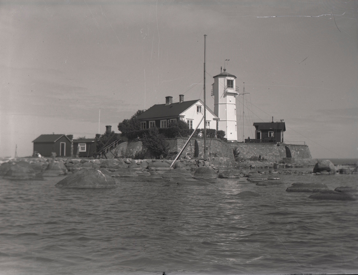 Grimskärs fyr från söder. Fyren revs vintern 1941-42. Notera den vita gaveln som fungerade som sjömärke.