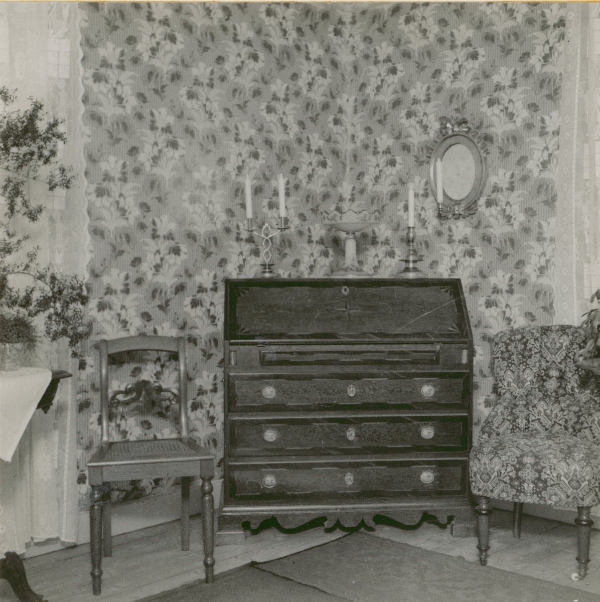 Korparyd. Interiör av salen. Snedklaffbyrån med intarsia är utfört i ett snickeriarbete, som synes vara ganska vanligt i socknen.