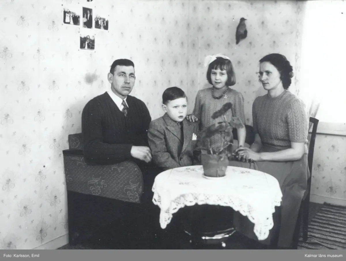 Axel Karlsson med maka Ester och barnen Gun och Guy Sternersson fotograferade i hemmet i Värnamo. Axel var broson till fotograf Emil Karlsson.