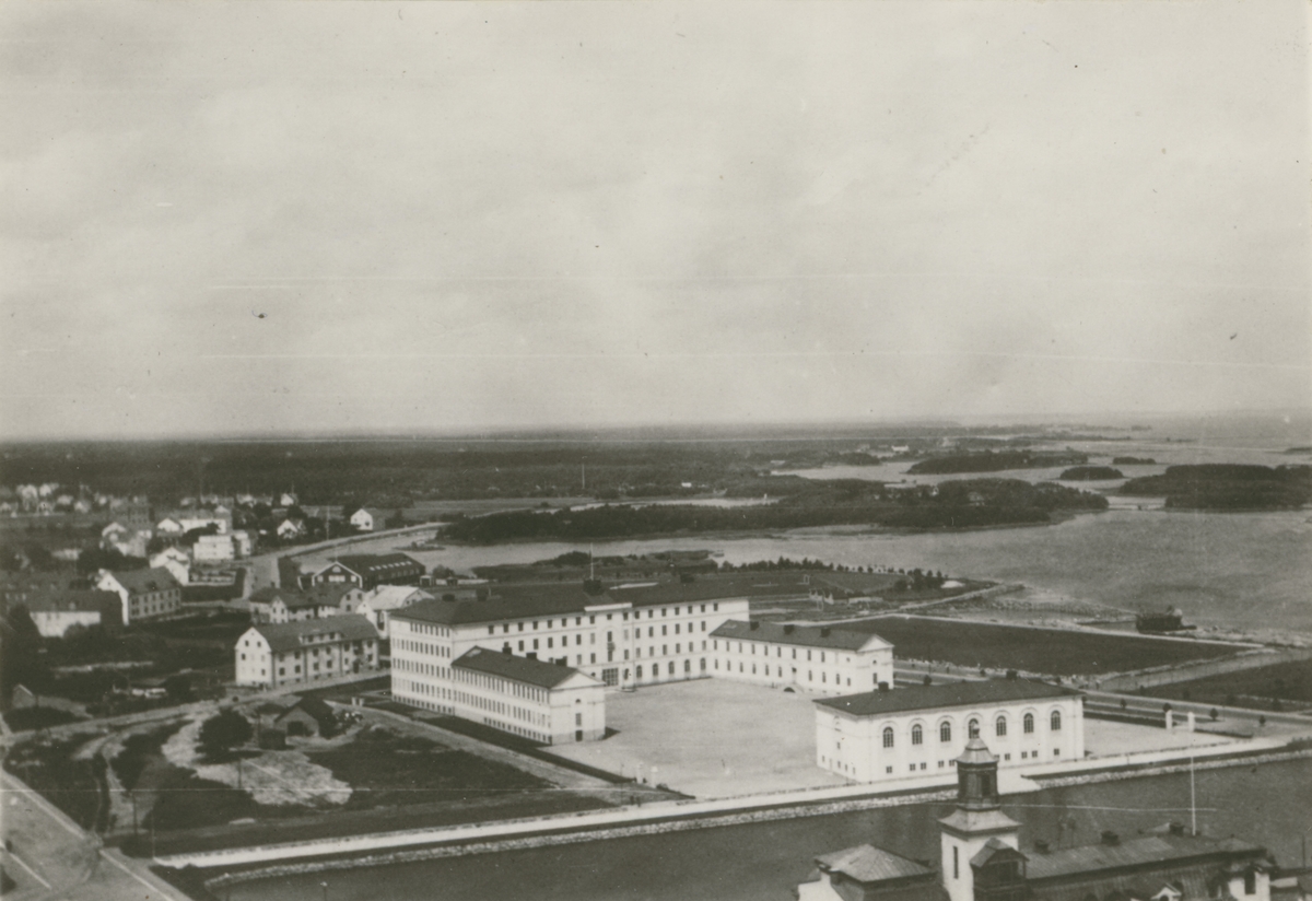 Vy över Stagneliusskolan med brandstationen i bakgrunden.