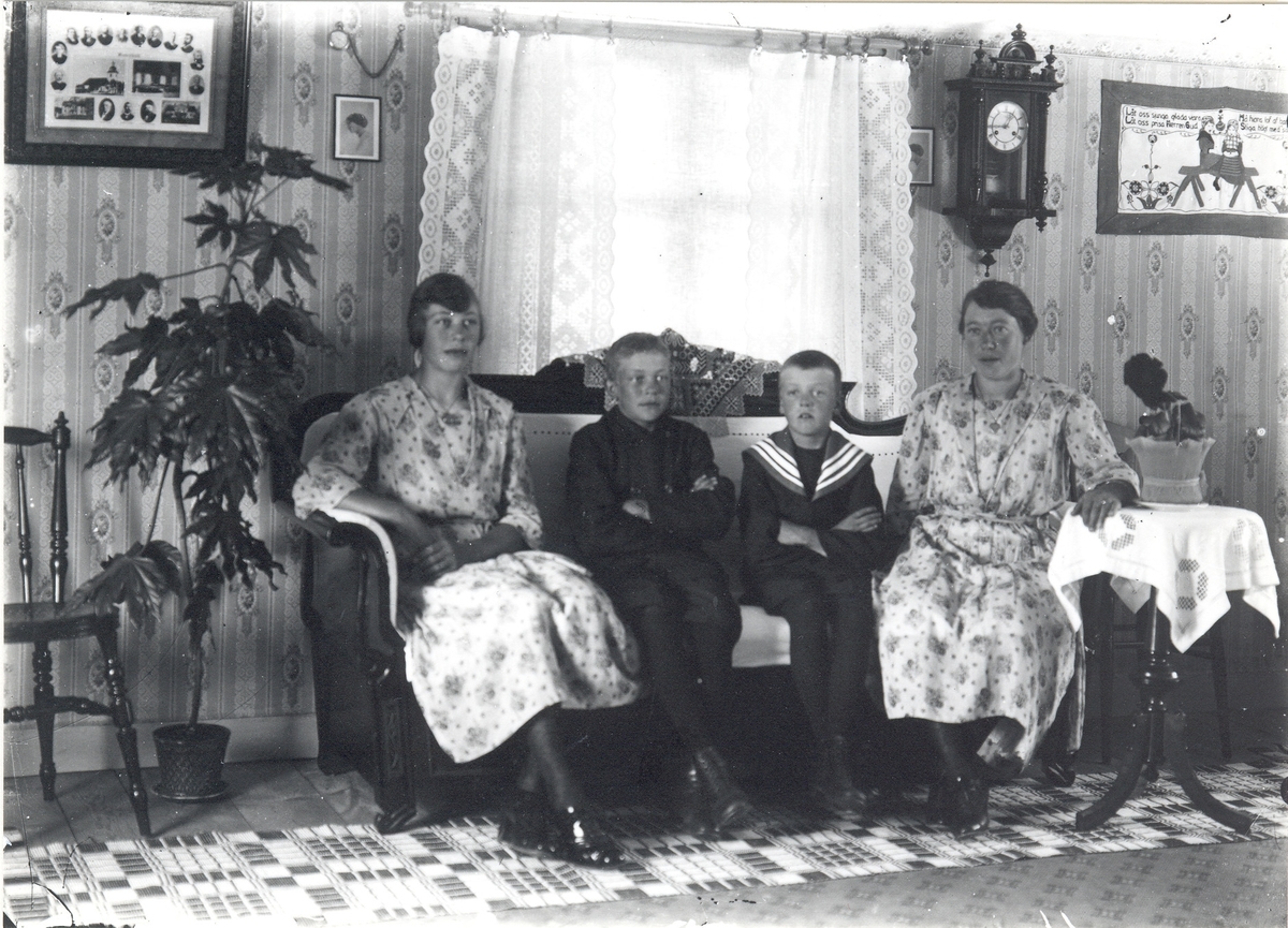 Syskonfoto. Från vänster: Märta Andersson, gift Nilsson, Artur Gillis, Anny, gift Karlsson, Bemärk rumsinteriören.