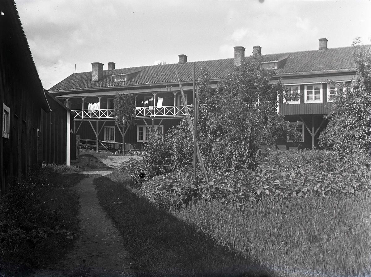 Lång länga i två våningar innehållande verkstäder och bostäder.