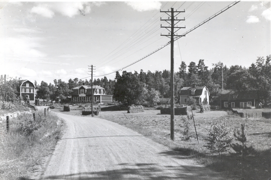 Bilden visar en grusad väg, kantad av telefonstolpar, som leder mot några hus, däribland ett med en affär. På fasadskylten på affärsbyggnaden kan det stå "Konsum".