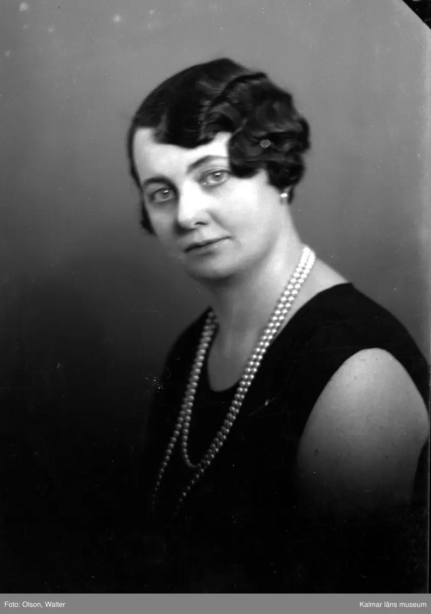 Ateljébild på en kvinna i halsband och klänning. Enligt Walter Olsons journal är bilden beställd av fröken S Svanfeldt.