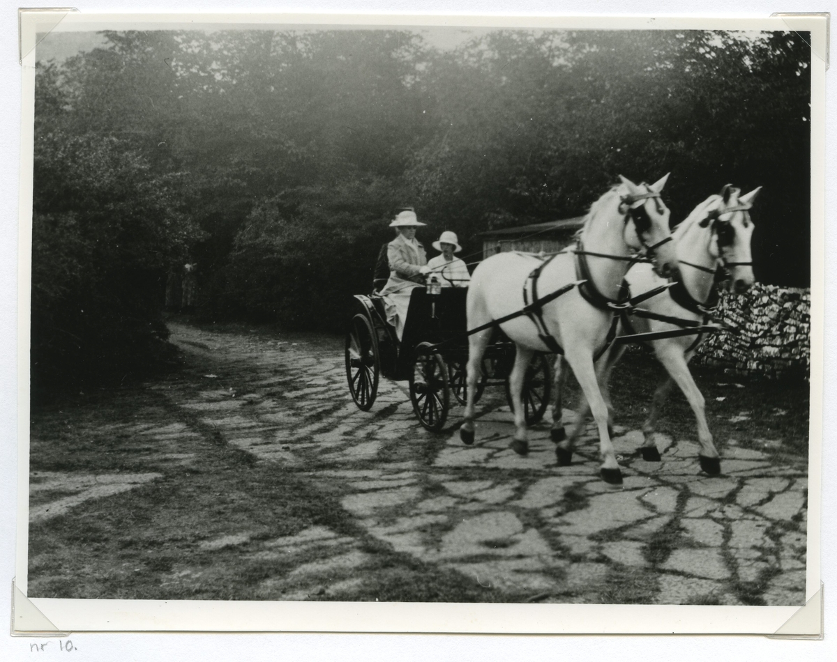 Två damer i vagn, förspänd med två vita hästar. Bild från Skälby gård 1924.