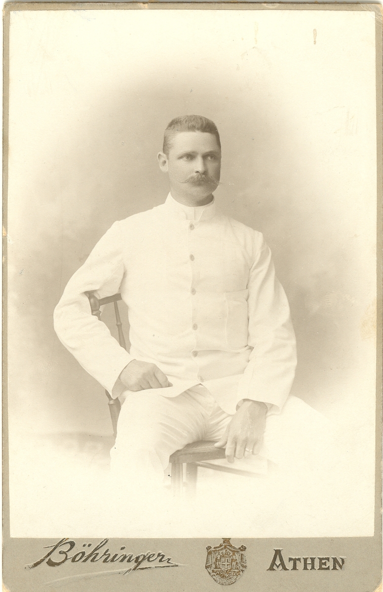Foto omkring 1900, taget i Athen under E:s tjänst i Neptunbolaget, som hade arbete i Grekland. Sjökapten, hamnkapten i Kalmar. Född 1865 i Skepplanda församling.