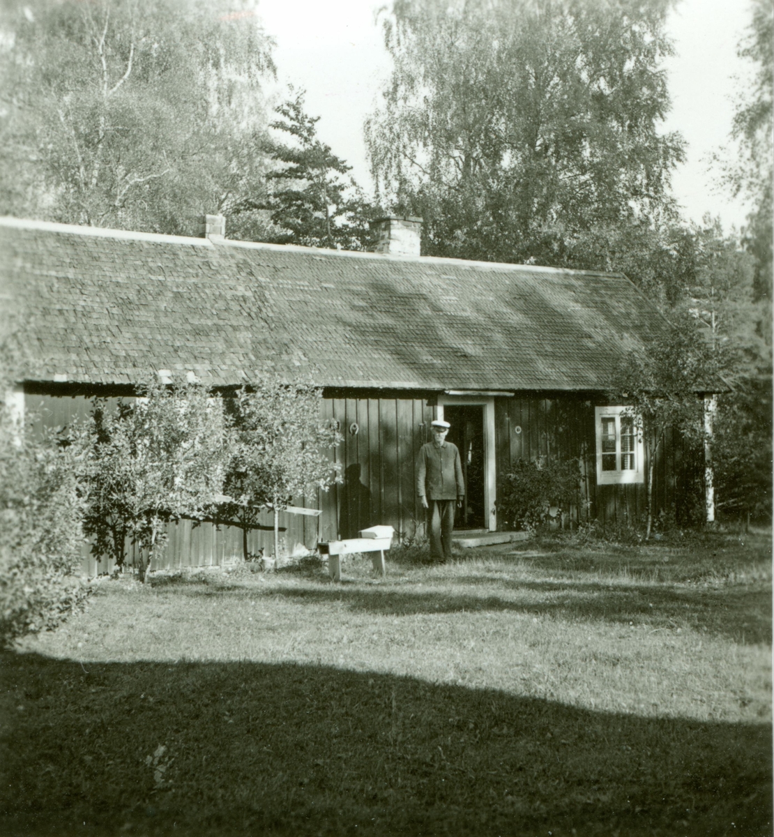 Före detta båtsman B Englund 73 år, (1938), framför sitt torp. Torpet byggdes av Englunds far, även han båtsman.