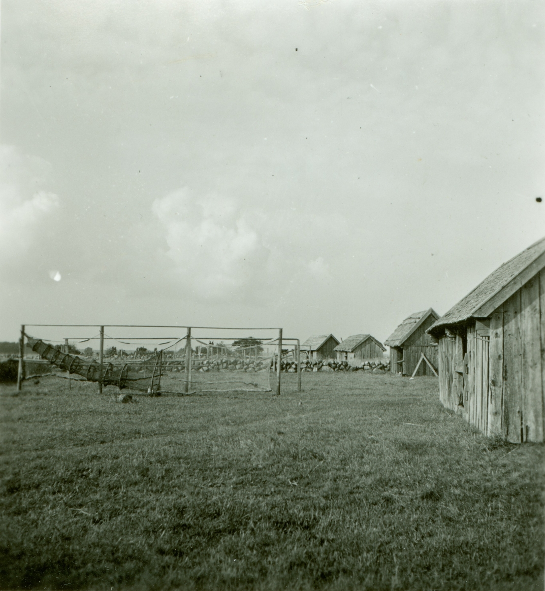 En ryssja på tork vid sjöbodar.