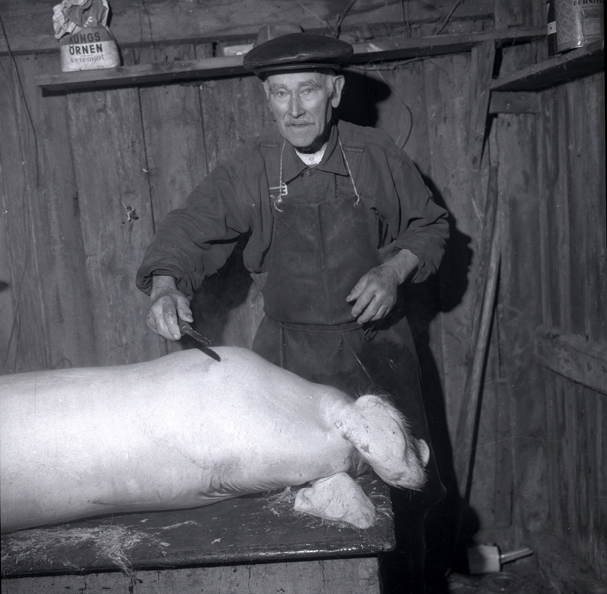 Grisslakt, byslaktare Alfred Persson Trosnäs, Persnäs. 80 år 12/12 -61. Grisen skrapas fri från hår.
