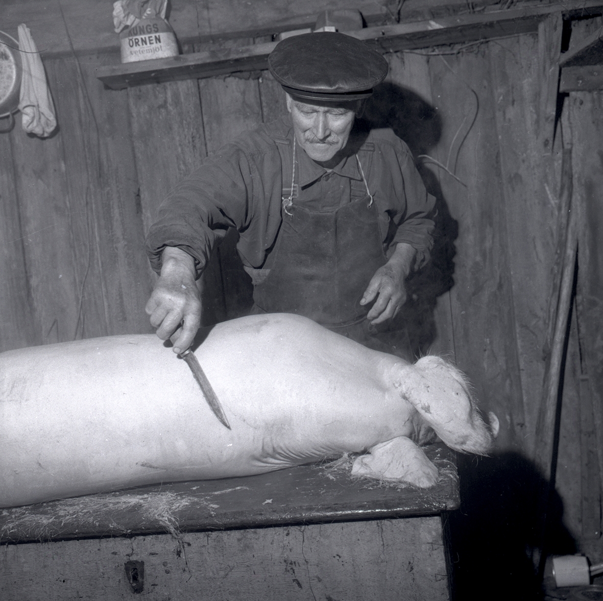 Grisslakt, byslaktare Alfred Persson Trosnäs, Persnäs. 80 år 12/12 -61. Grisen skrapas fri från hår.