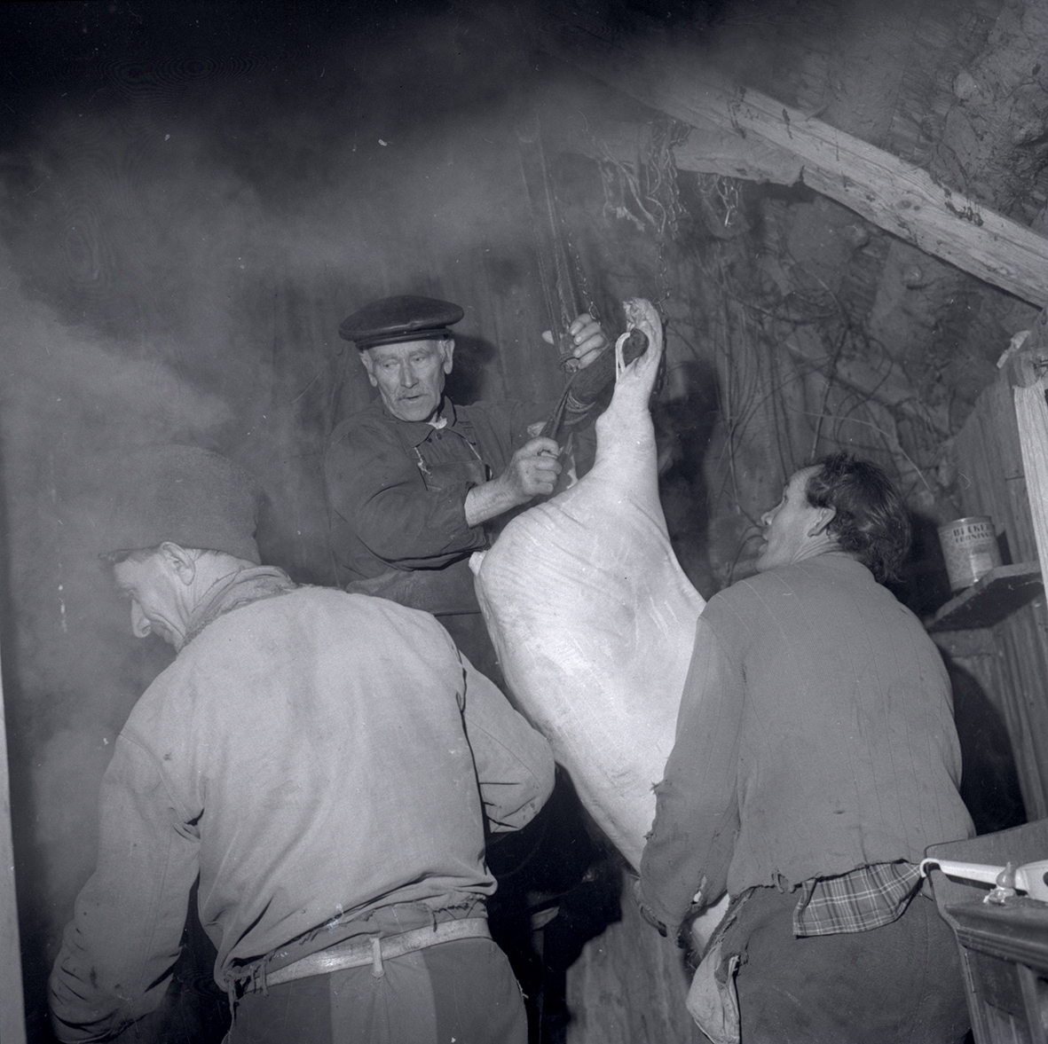 Grisslakt, byslaktare Alfred Persson Trosnäs, Persnäs. 80 år 12/12 -61. Den urtagna grisen skållas.