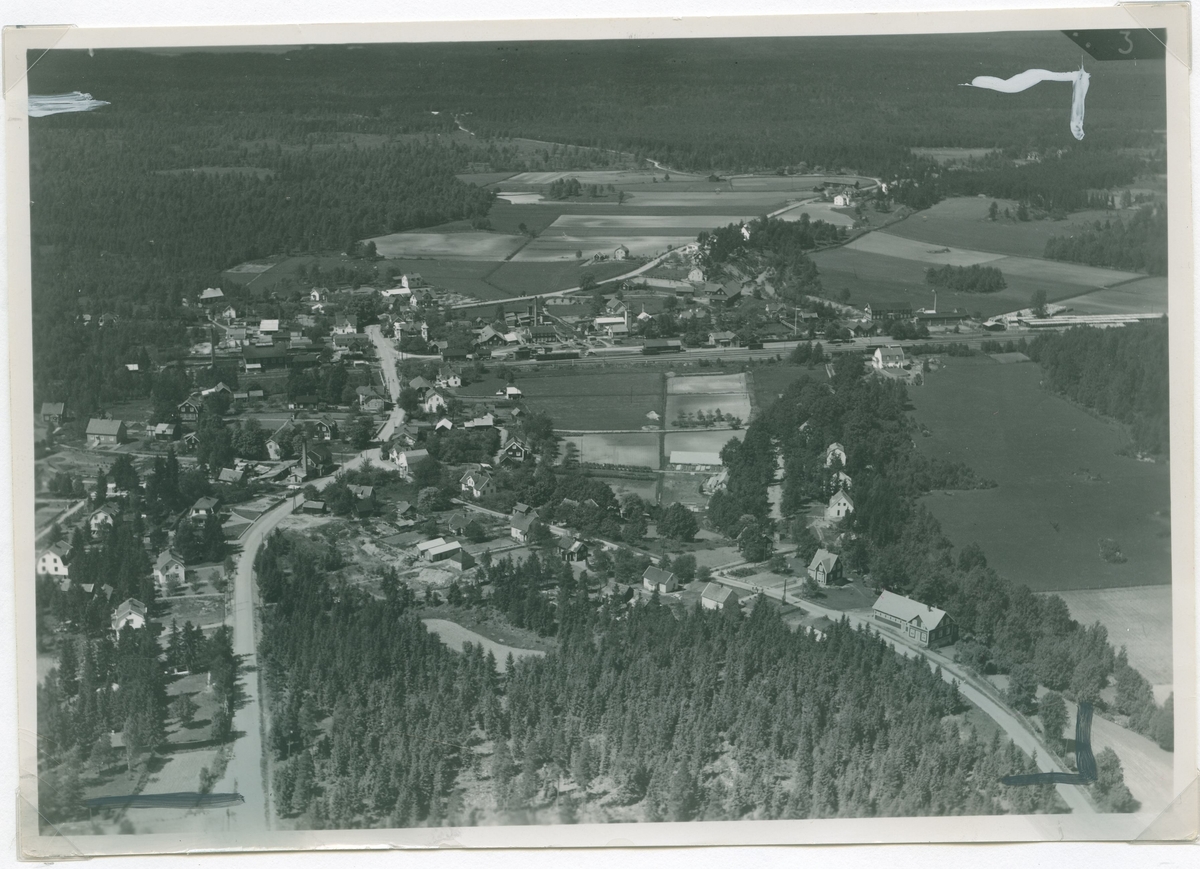 Flygfoto över Ruda med grusvägen och bostäder och åkrar.