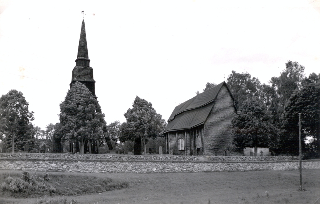 Vy över Frödinge kyrka med klockstapeln och stenmuren framför kyrkan.