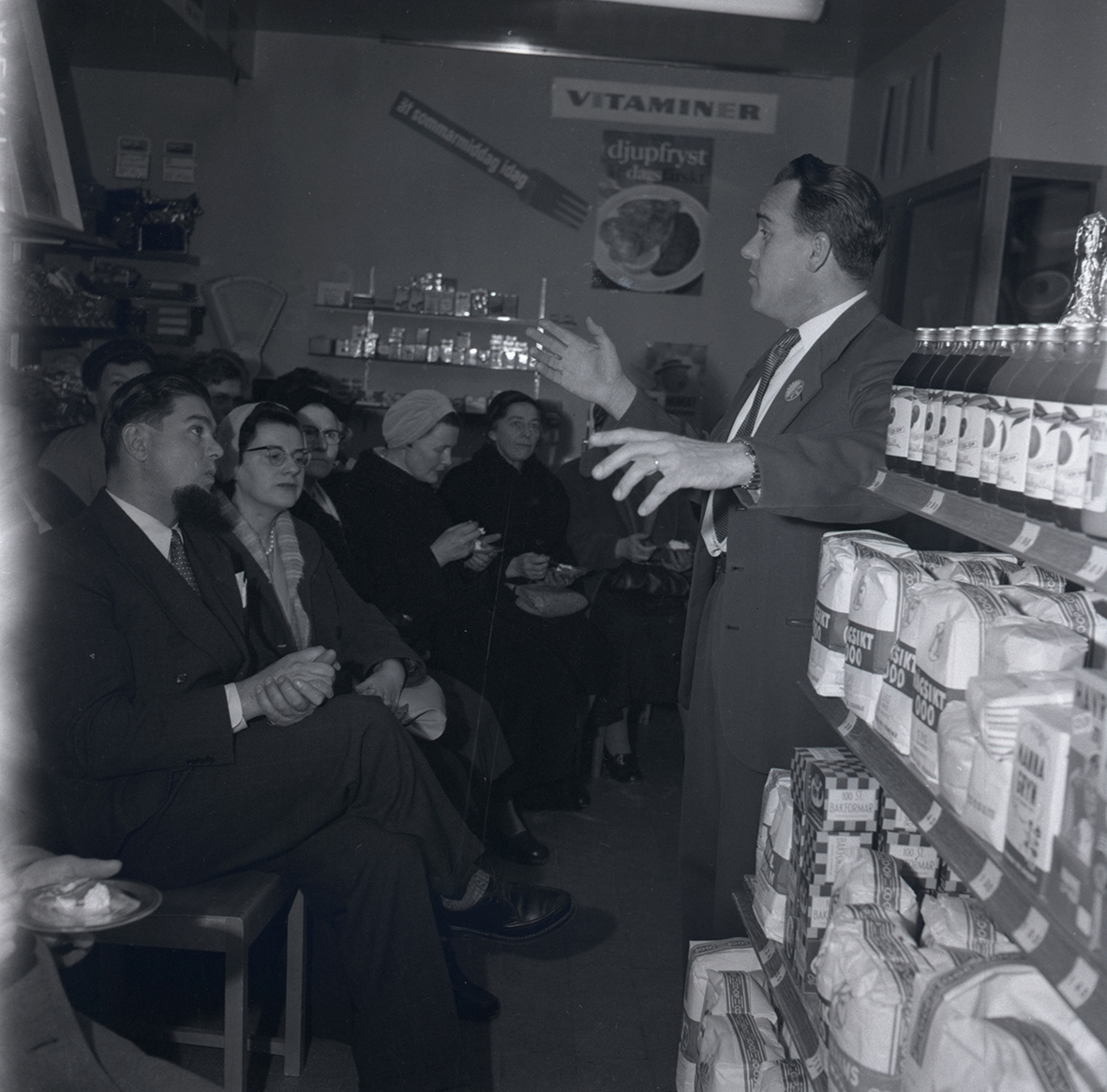 En man i kostym som talar inför publik på Konsum.
