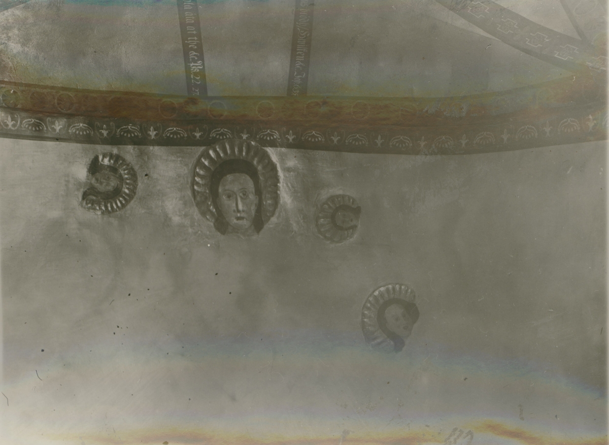 Korabsidens valv i Hossmo kyrka, med fragment av relief-dekoration från romansk tid.