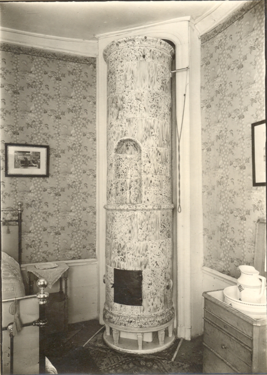 Vita gästrummet i övre våningen. Kakelugn med blågrönt stänk, rätt ymnigt och delvis flutet. Träfötter på rund järnskiva. smidd enkellucka. Krönsims troligen upp och ned. Golvet oljemålat gulvitt med schablonerade stjärnor, grå fris längs väggarna.