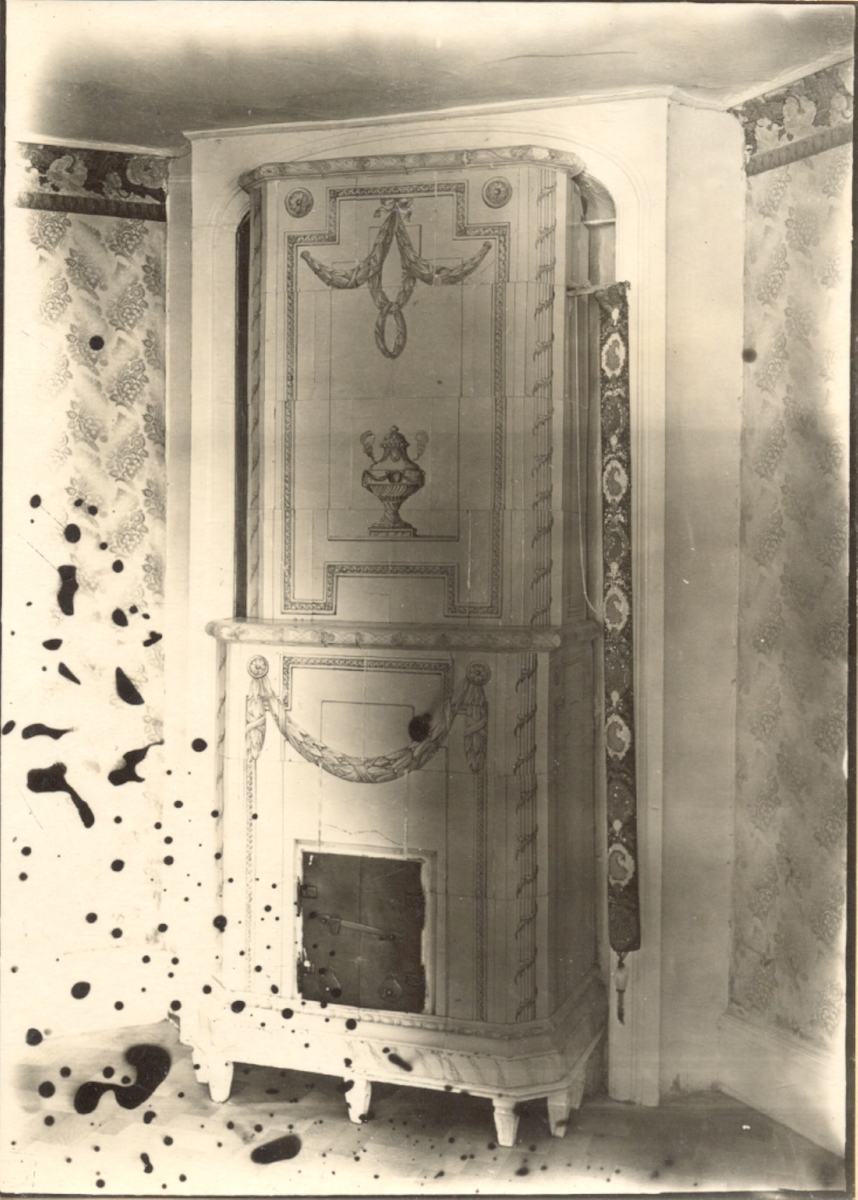 Berga herrgård. Lilla matsalen i bottenvåningen. Kakelugn med dekor i grönt, krön- och skänkgesimserba i grönt och blek lila. Vitmålad träfot, smidda järnluckor.