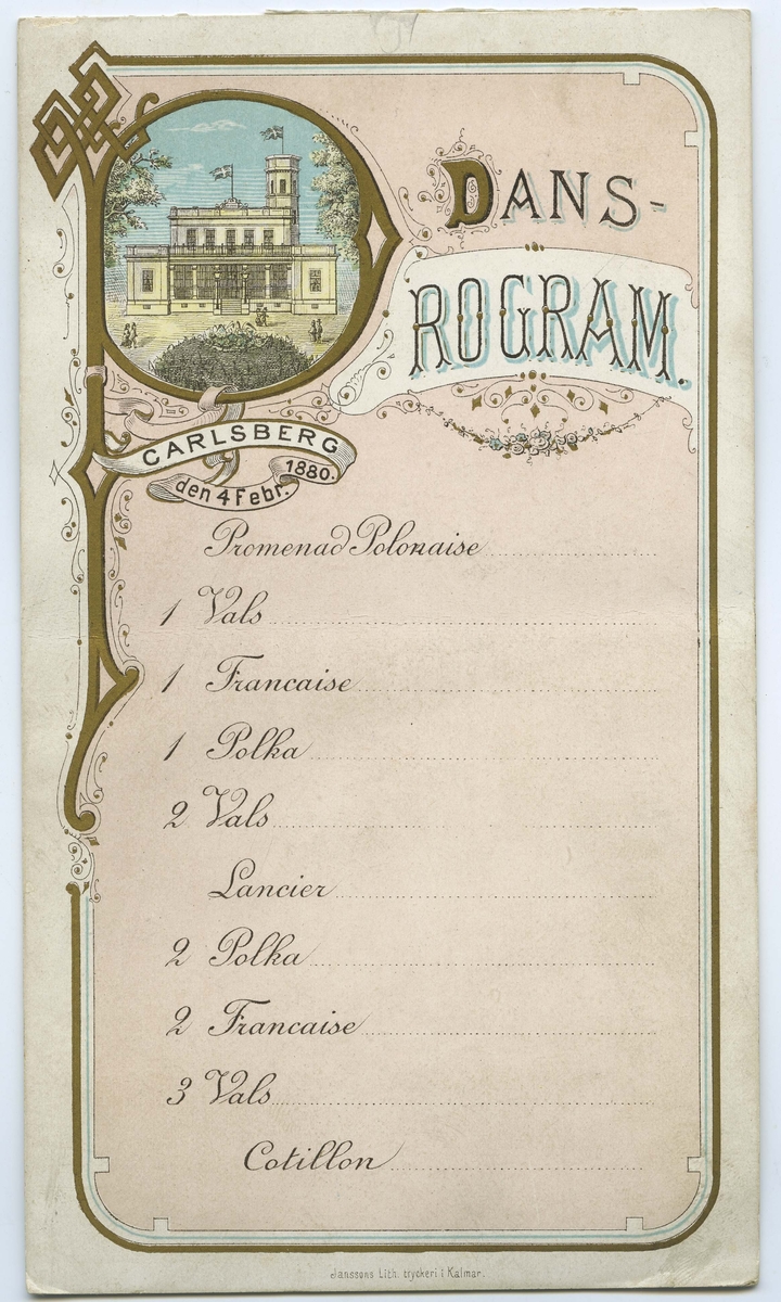 Titel: Dansprgram. Carlsberg den 4 febr. 1880. Promenad Polonaise. 1 Vals, 1 Francaise, 1 Polka, 2 Vals, Lancier, 2 Polka, 2 Francaise, 3 Vals, Cotillon.