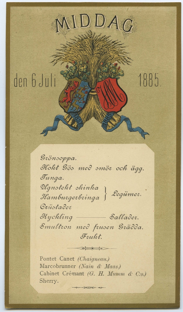 Kunglig middag den 6 juli 1885. Grönsoppa. Kokt gös med smör och ägg. Tunga. Ugnstekt skinka/ Hamburgerbringa Legümer. Crüstader. Kyckling - Sallader. Smultron med frusen grädde [glass]. Frukt.