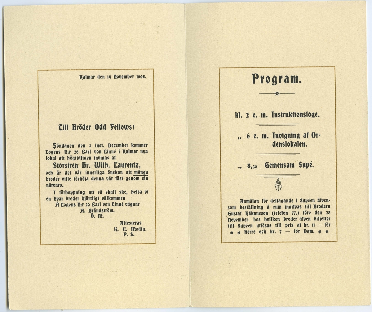 Inbjudan till Bröder Odd Fellows invigning av nya lokalen Kalmar 14 november 1905.