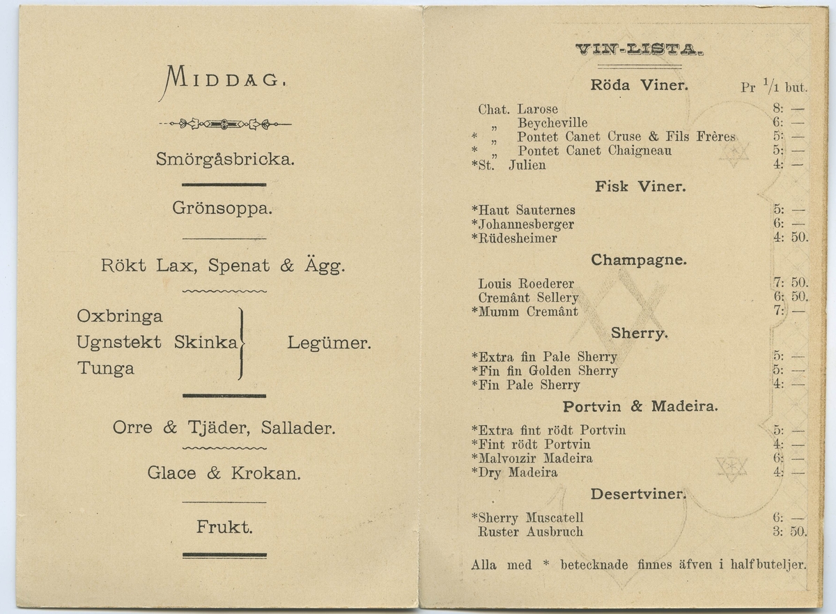 Meny och prislista vid 25 årsjubileet för St Johannislogen Carl. Tydligen stod logen för maten medan gästerna fick betala drickat själva.