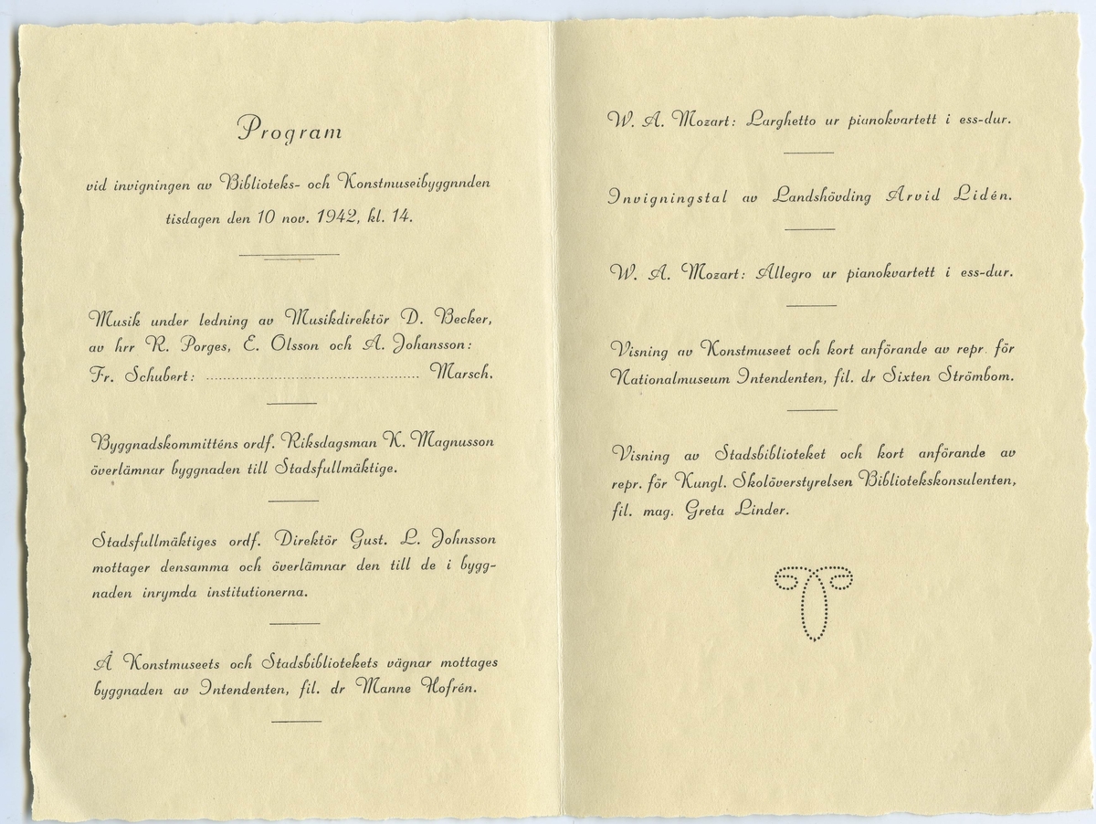 Program vid invigningen av Biblioteks- och Konstmuseibyggnaden tisdagen den 10 nov. 1942, klockan 2.