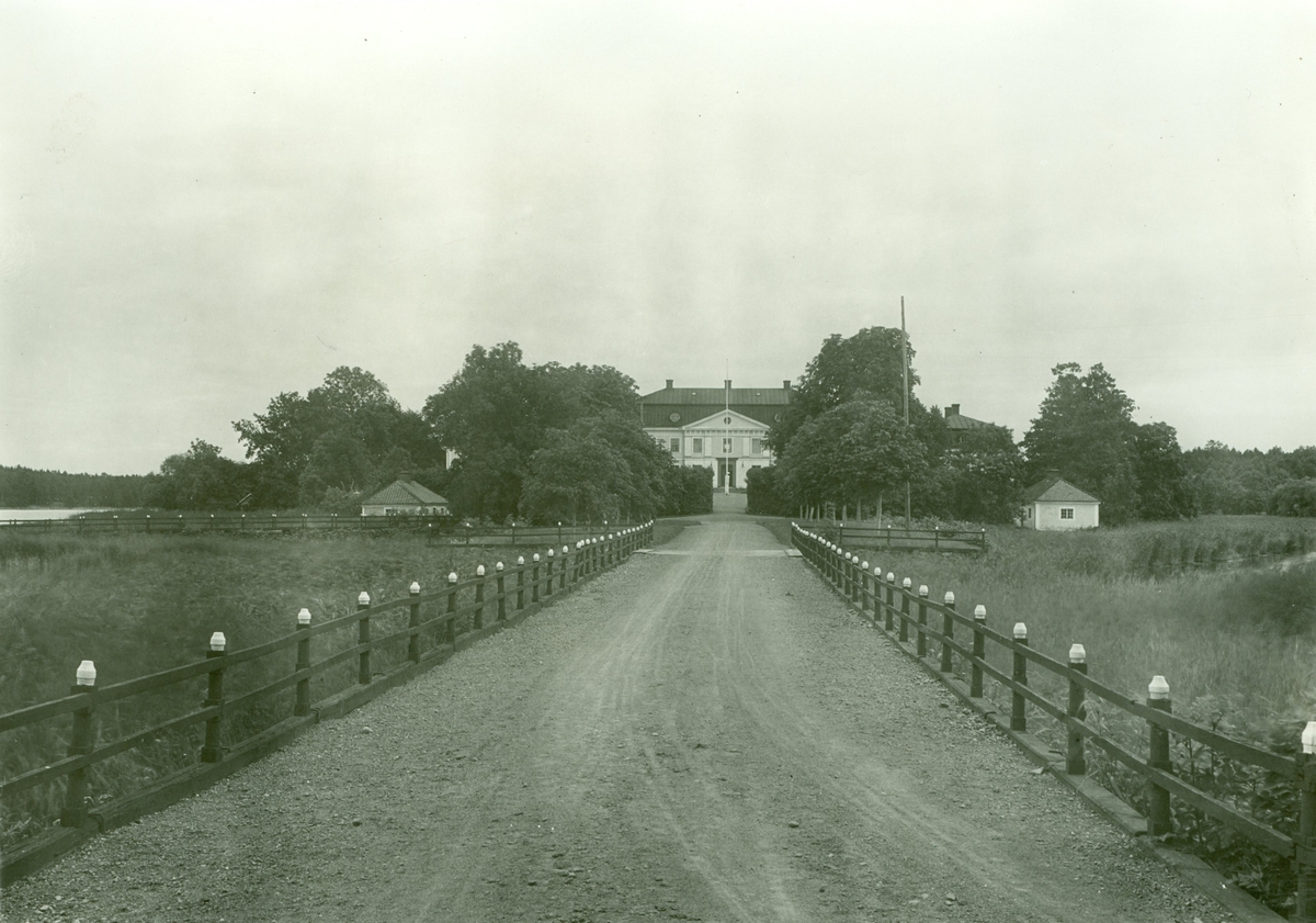 Uppfarten till mangården. Mangårdshusen av sten, gula med vita lister, pilastrar och foder. På vänster hand utgår vägen till Biblioteksholmen.