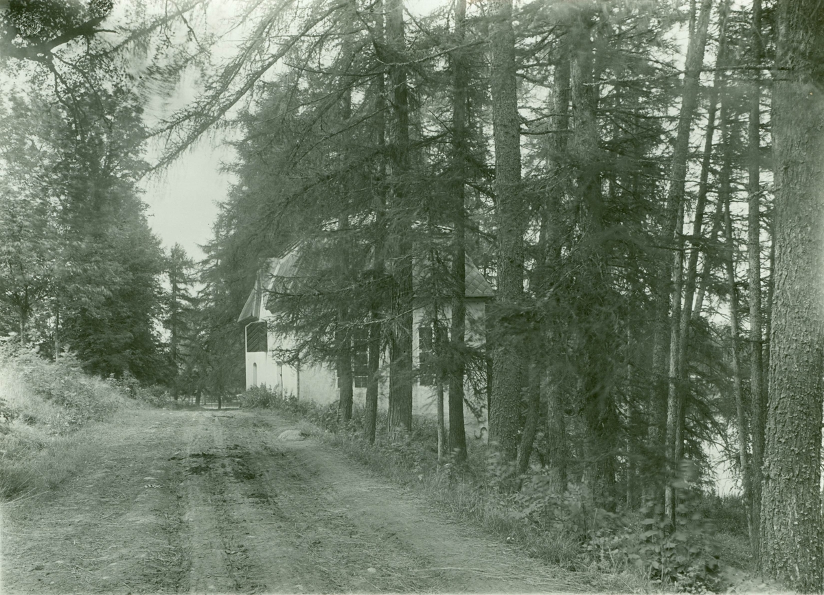 Vägen till ladugården på Fågelviks herrgård med den stora lärkträdsplanteringen. I mitten magasinet.