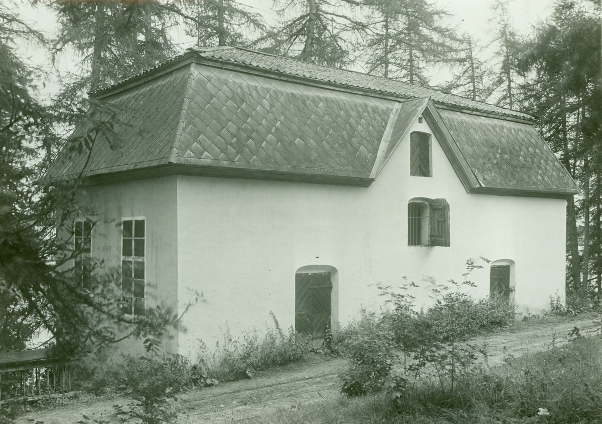 Magasin vid vägen till ladugården av sten. Väggar putsade gulvita, dörrar och luckor tjärade. Brutet tak med tegel i över fallet, skifferplator i under. Beslag på högra dörren.