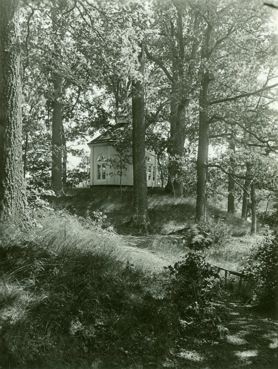 Lusthuset, på en holme i sjön, mittför huvudbyggnaden. . I det inre takmålningar av Taraval. Åttakantigt trähus med topptak med lanternin. Flöjel med init. C. P. Väggar vita, svart papptak.