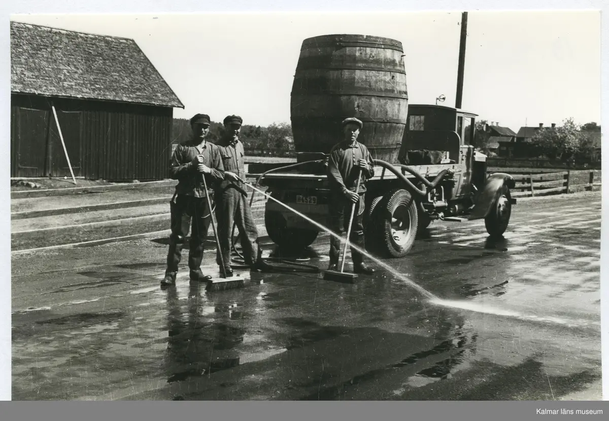 Vägen genom Målilla spolas och förbereds för asfaltering med en lastbilsburen pumpanordning.