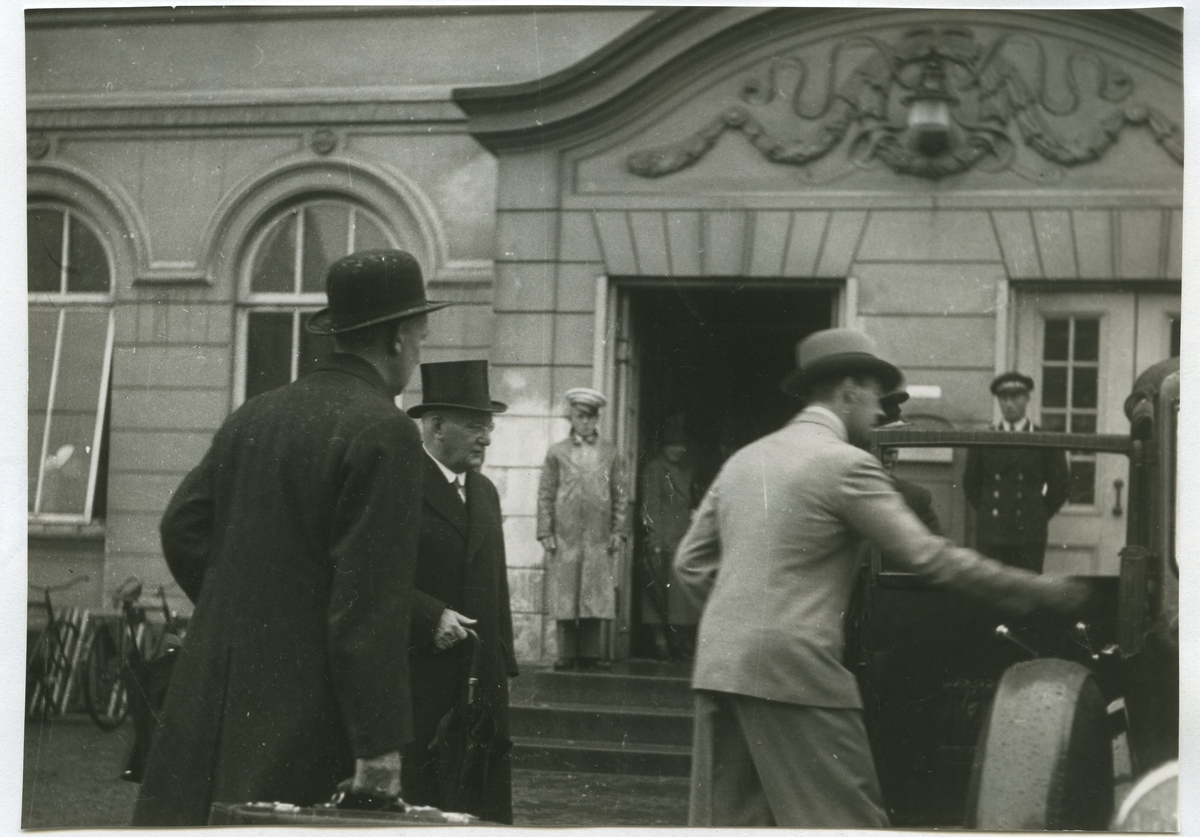 Landshövding John Falk, Kalmar (till vänster i hög hatt). Vid bilen prins Gustaf Adolf.