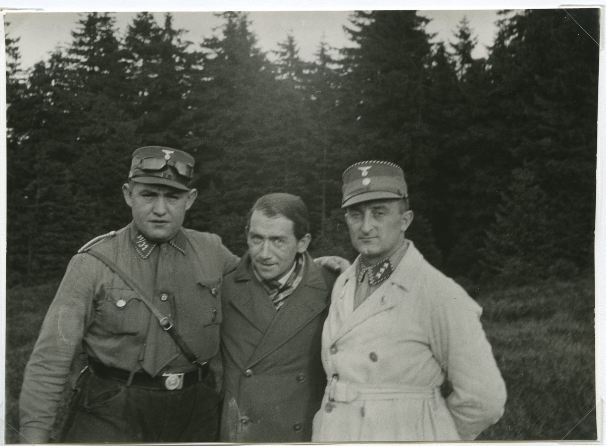 Hovfotograf Walter Olson, Kalmar, omgiven av två SA-män i närheten av gravmonumentet vid Sommerbachskopf i Tyskland.