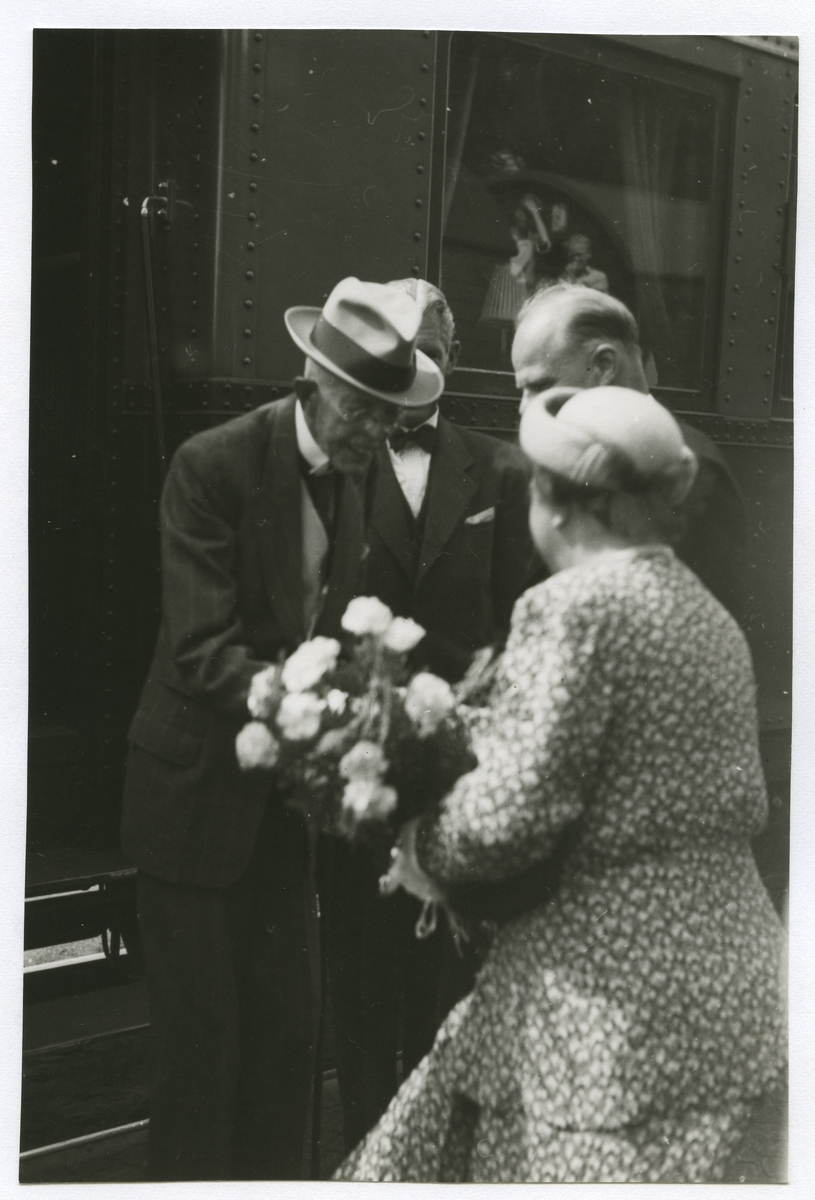 Gustav V och landshövdingeparet Ruben och Helga Wagnsson vid Centralstationen i Kalmar, slutet av 1940-talet.