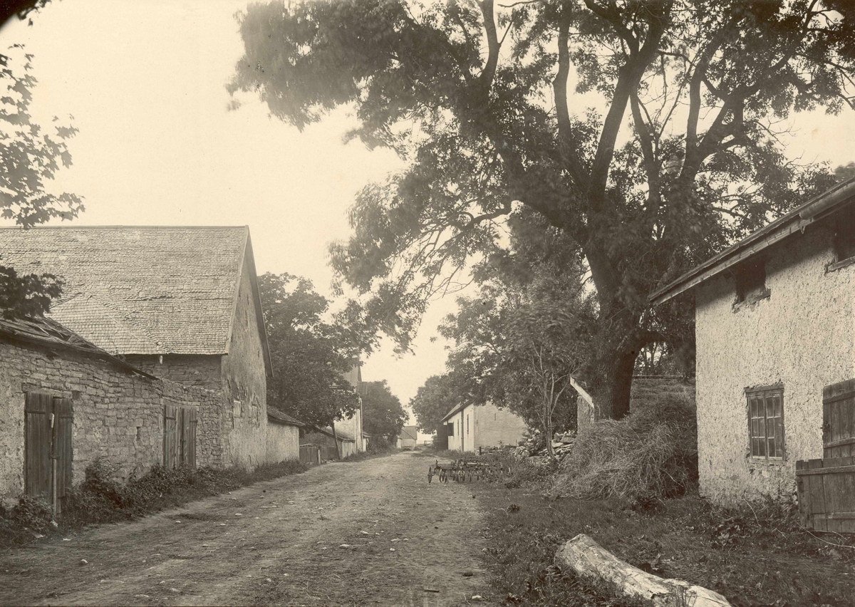 Byagatan med herrgården närmast. T.v. gavlarna av de gamla flyglarna i mangården. Till höger ett gammalt bränneri.