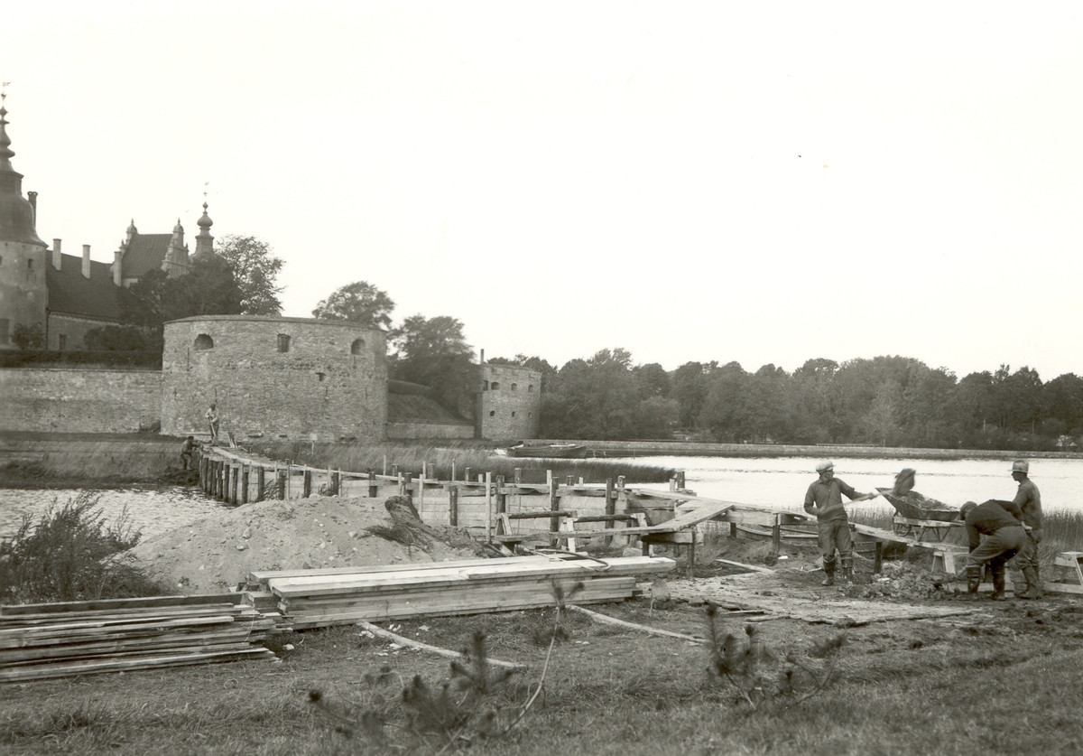 Utgrävningen i slottsfjärden 1932-1934 med ledning av Harald Åkerlund. Bedrevs som AK-arbete. Fyllmassorna användes för att bygga upp nuvarande tjälhovet. I den syrefattiga lera hade det organiskt materialet bevarats väl. Varför man forutom keramik även fann ett flertal fartyg samt smärre fynd som handskar och skor.