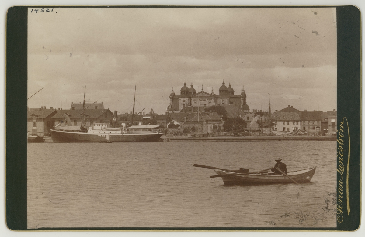Vy över hamnen med Kavaljeren och Domkyrkan i fonden. I förgrunden en man i en roddbåt.