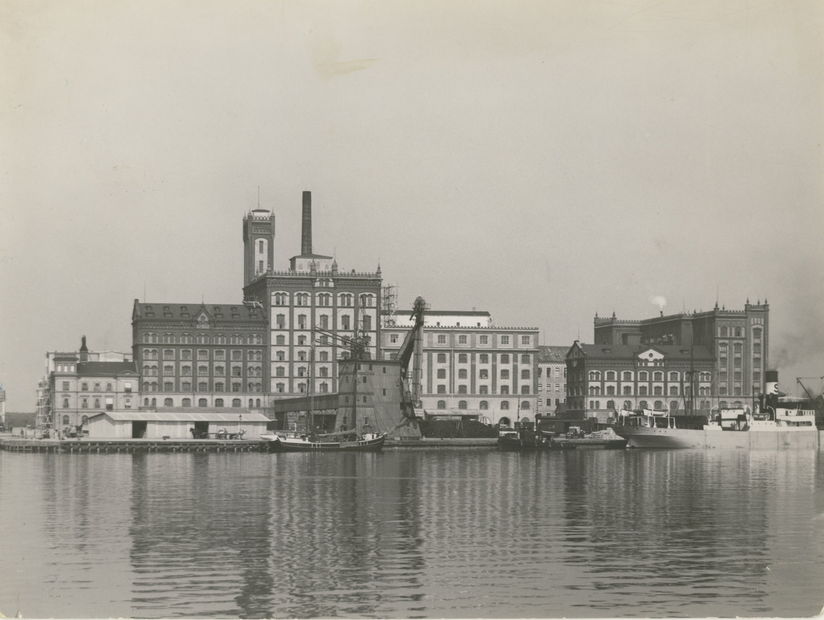 Vy med Ångkvarnen och Riskvarnen sedda från vattnet.