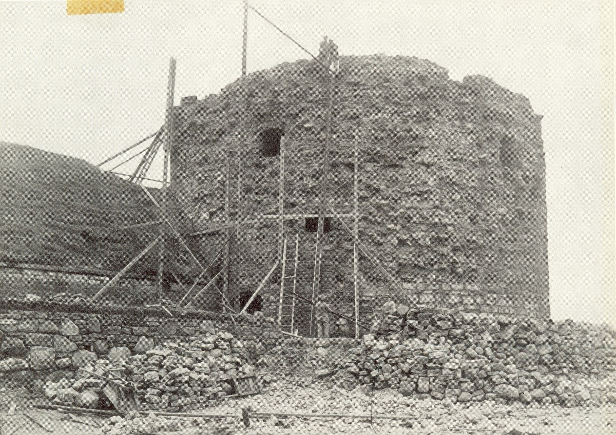 Västra postejen sedd från nordväst med nedtagen yttre skalmur. Foto H.Å. mars 1934.