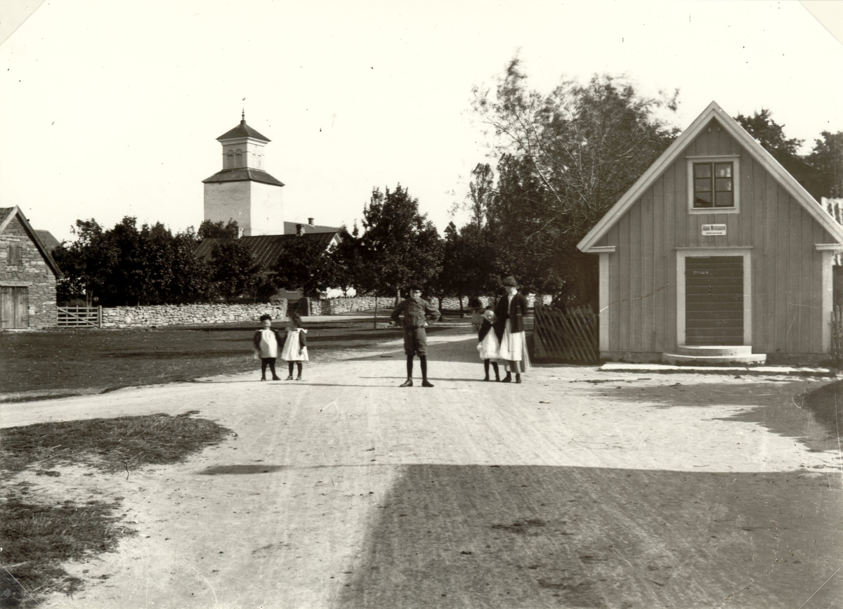 Palmelund. Sjöstrands affär till höger. Skolan till vänster. Affären byggd 1873.