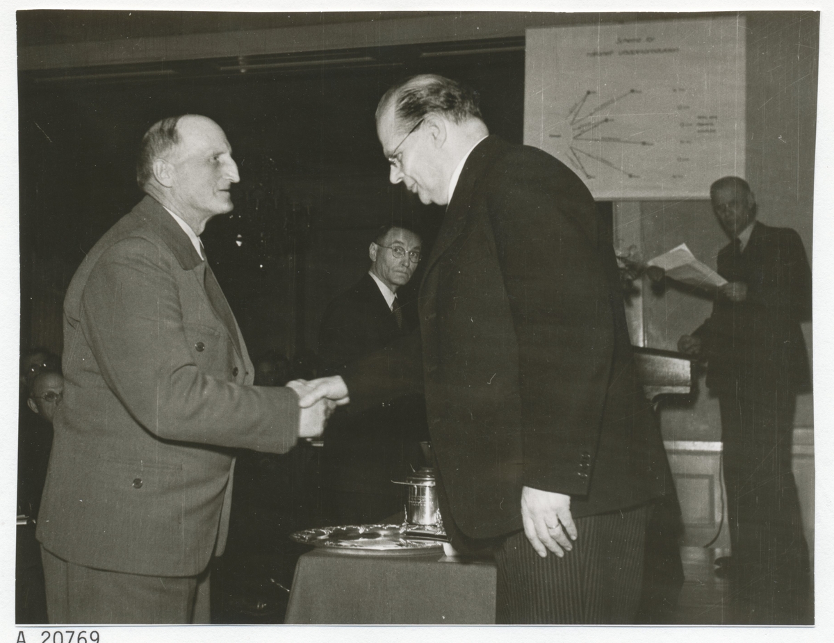 Landshövding Ruben Wagnsson, Kalmar prisutdelare. Mannen längst till vänster agronom Broman, Kalmar omkring 1948.