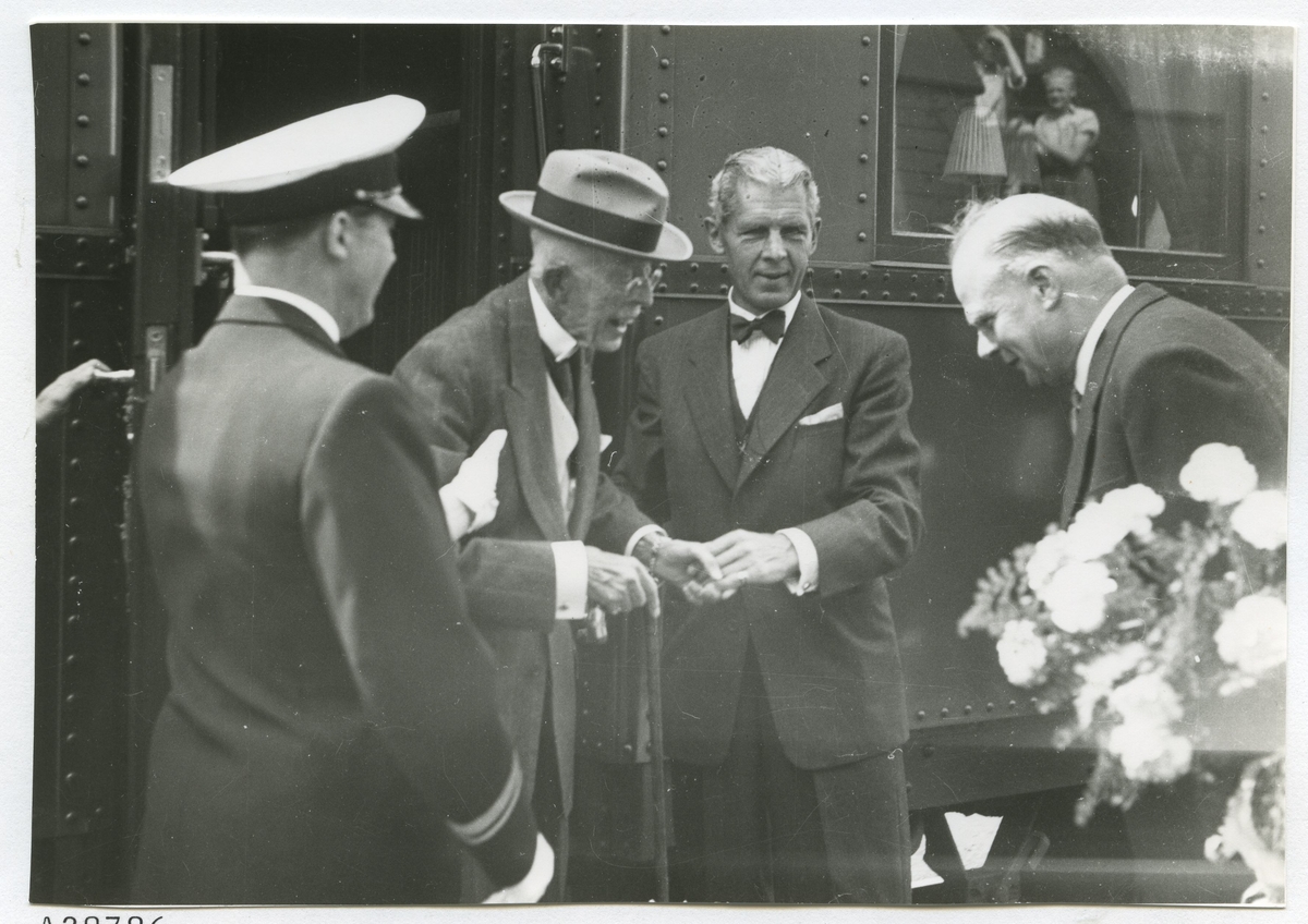 Gustav V och landshövding Wagnsson som överlämnar blommor på Kalmar Central.