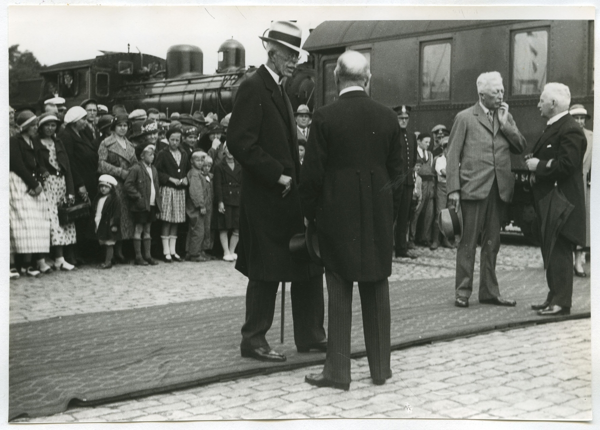 Gustav V och Prins Eugen i samspråk med landshövding John Falk och konsul Jeansson vid Kalmar Central. 1930-talet.