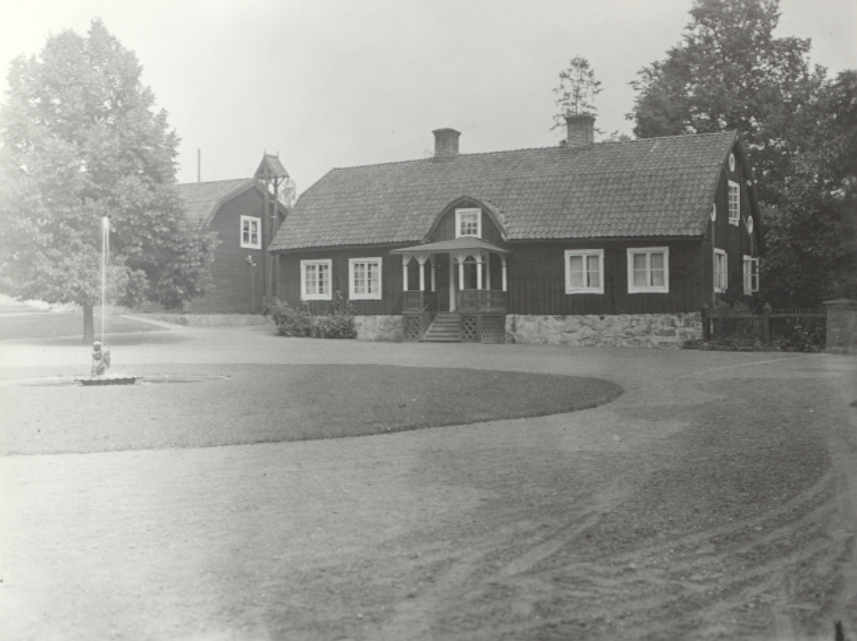 Tyllinge. Flyglarna. Till vänster klockhuset. Timmer i laxknut med infodrade knutar. Nu garage.