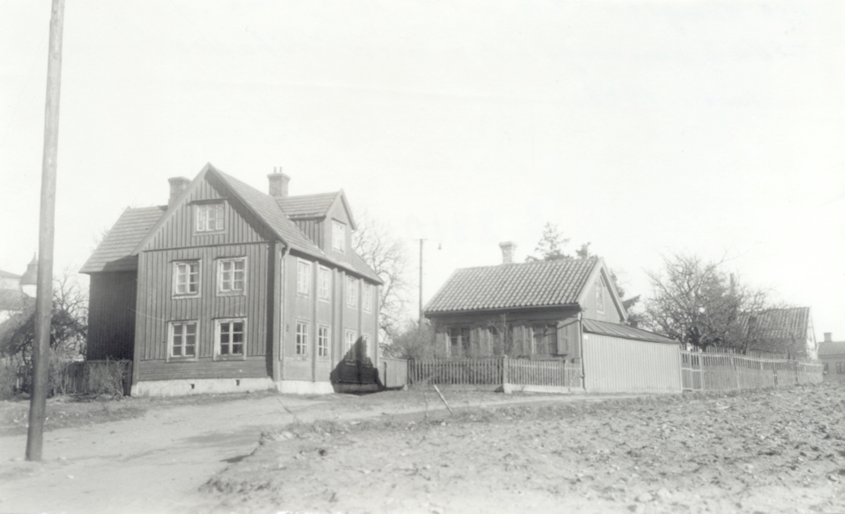 Nya Kungsgatan med Villa Alma till höger, Lilla Dammgatan till vänster med Hökaboet. Omkring 1939-1945.