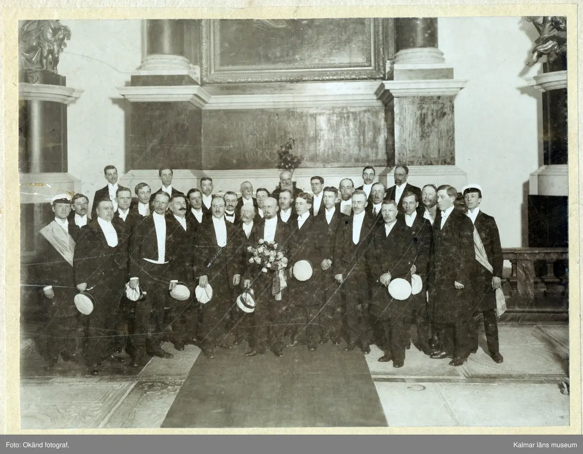 Snett bakom blombuketten i mitten står en sångare, som är ensam om att ha svart fluga: hans namn är Gustaf Hjalmar Johansson (anfader till släkten Klette i Kalmar), född 17/5 1863, död 1935. Bodde på Tullslätten och var landsfiskal (son till storsångaren och kantorn i Åby: Johan Alfred Johansson.)