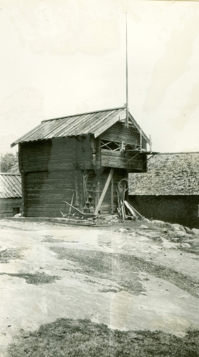 En loftbod i Ekeberga med undre våningen av rundtimmer.